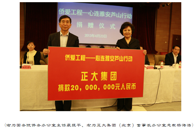 2013年4月20日8時02分,四川省雅安市蘆山縣發生7.0級地震。消息傳來,舉國震動。中國人民心連心,一方有難八方支援,全國人民與雅安人民站在一起。社會各界紛紛伸出了援助之手,對災區進行了各種形式的捐助、支持與幫助。4月23日,正大集團為雅安地震災區捐款人民幣2000萬元,集團(北京)董事長辦公室楊海浩總裁代表集團出席國務院僑辦舉行的“僑愛工程——心連雅安蘆山”行動捐贈儀式。 正大集團是泰籍華人創辦的跨國公司,自一九七九年進入中國,在中國的投資遍及除青海、西藏以外的所有省、市、自治區,員工人數超過8萬人,年銷售額超過500億人民幣,形成了以農牧業、食品業、商業零售業為核心,制藥、機車、房地產、國際貿易、金融、傳媒等領域共同發展的業務格局。 正大集團董事長、中國僑商投資協會會長謝國民先生是著名的愛國僑商,對中國懷有特殊感情。長期以來,熱心家鄉教育、公益事業、醫療事業和扶貧救災,累計捐資超過3億元人民幣。僅2012年全年捐資近2000萬元人民幣。 謝國民集團董事長在雅安地震發生之后,心系災區人民,密切關注災情,第一時間為雅安地震災區捐款2000萬元人民幣。正大集團愿與全國人民一道支援災區人民奪取抗震救災的全面勝利!